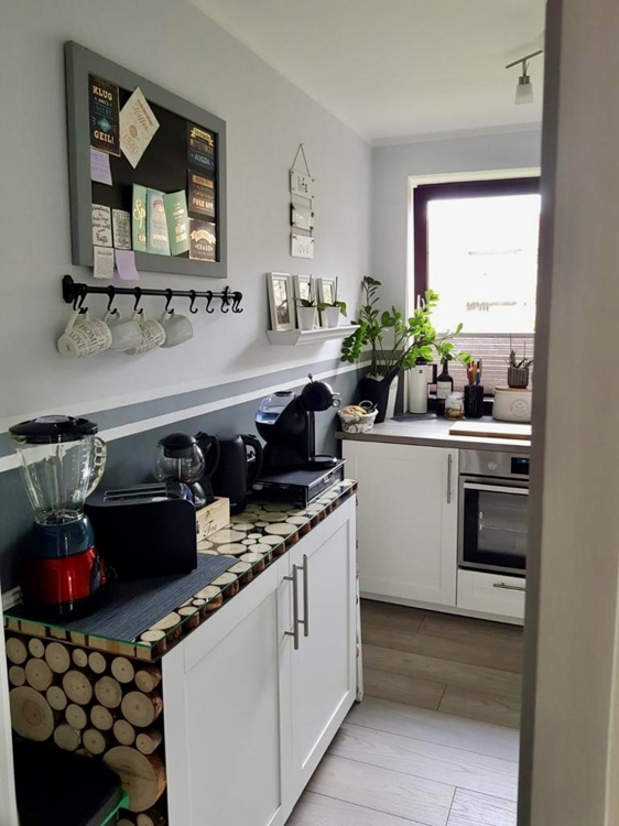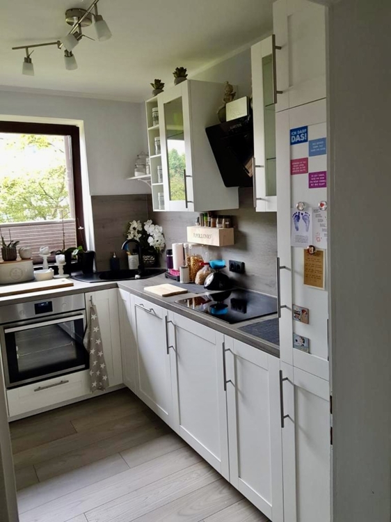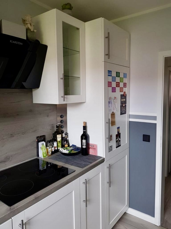 Vom Flur verteilen sich die einzelnen Zimmer. Das moderne Badezimmer erstrahlt in grauen Hochglanzfliesen, die Dusche wurde mit Ornamenten aus Natursteinoptik verschönert und es verfügt über einen modernen Waschtisch sowie einen Hängeschrank. Die Anschlussmöglichkeit für eine Waschmaschine ist vorhanden. Des Weiteren begehen Sie das halbe Zimmer, welches sich ideal als Büro oder Gästezimmer nutzen lässt. Das Schlafzimmer bietet gute Stellmöglichkeiten. Die Küche ist gefliest und verfügt über eine moderne Küchenzeile mit Einbaugeräten. Das großzügige Wohn- und Esszimmer, mit Zugang zum Balkon, wird durch seine vielen Fensterflächen mit Licht durchflutet. Der schöne Süd-Balkon, mit Blick ins Grüne, lädt zum Entspannen ein. Auch eine kleine Abstellkammer ist vorhanden und bietet Ihnen wertvollen Stauraum. Zur Wohnung gehören ein gemeinschaftlicher Waschraum, ein Trockenraum, ein Fahrradraum sowie ein privater Kellerraum. Die Beheizung erfolgt über Gas.