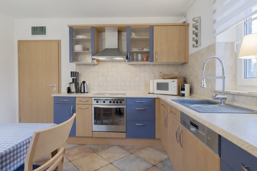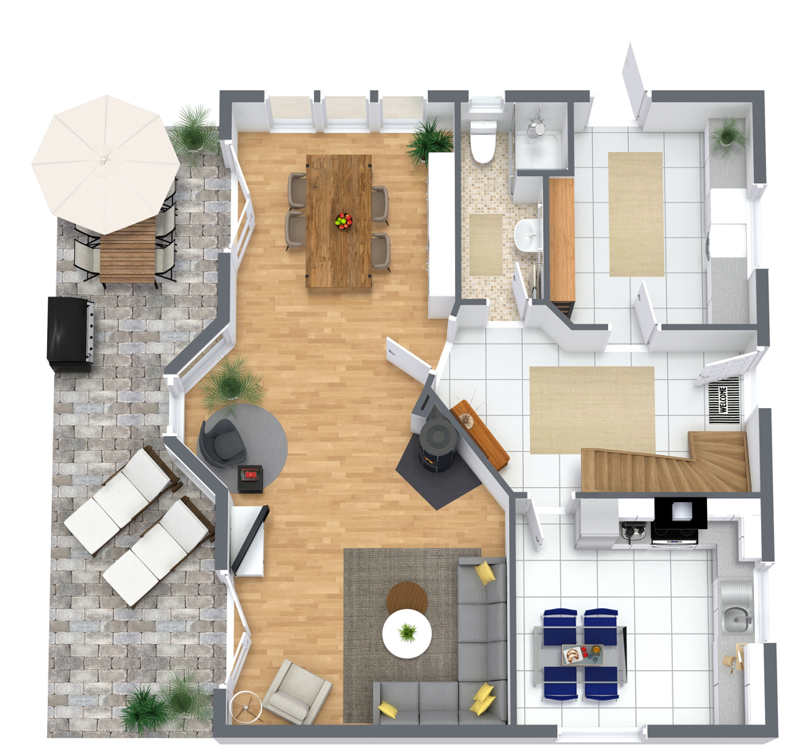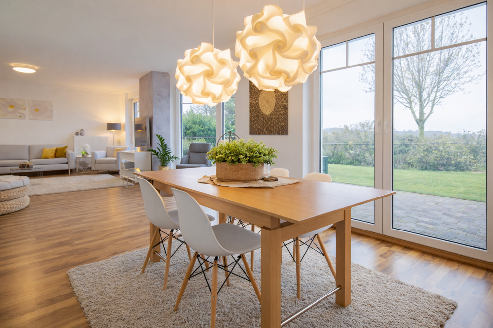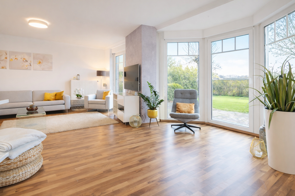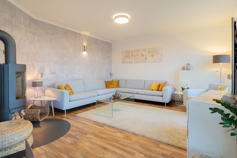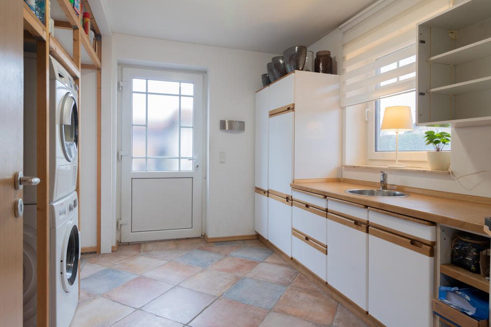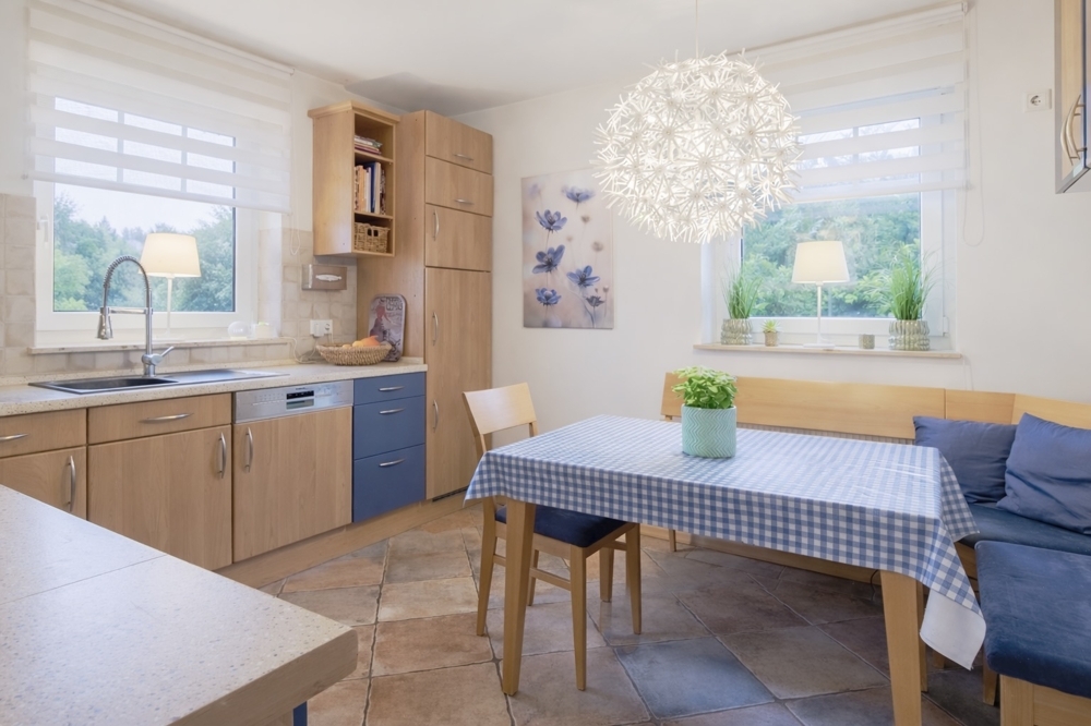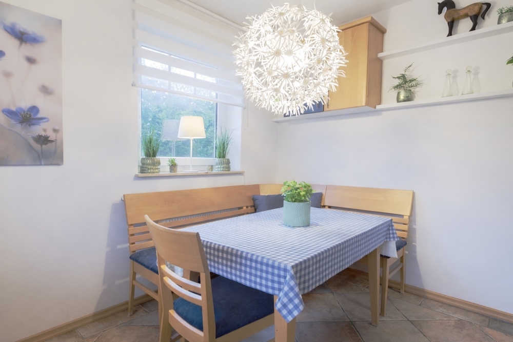 Sie betreten die Immobilie und gelangen in den einladenden Flur. Von hier aus erreichen Sie die einzelnen Räume sowie das Dachgeschoss. Der Wohn- und Essbereich bildet das Herzstück des Hauses. Hier treffen warme Holztöne auf eine klare, moderne Gestaltung. Der drehbare Kaminofen setzt einen gemütlichen Akzent und lädt besonders in der kühleren Jahreszeit zum Verweilen ein. Der Kamin ist derzeit außer Betrieb und bedarf einer Nachrüstung gemäß den aktuellen gesetzlichen Vorschriften. Zusätzliche Wohlfühlatmosphäre erzeugt die Fußbodenrücklaufheizung im Wohn- und Essbereich. Von hier aus eröffnet sich ein schöner Blick ins Grüne, der den Wohnraum zusätzlich aufwertet. Die Küche ist praktisch geschnitten und mit ausreichend Arbeits- und Stauraum ausgestattet. Sie bietet ideale Voraussetzungen für den Alltag und verfügt über genügend Platz für eine Frühstücksecke. Auch hier wird der Wohnkomfort durch eine Fußbodenerwärmung erhöht. Darüber hinaus überzeugt das Erdgeschoss mit einem Tageslicht-Gäste-Bad, welches mit einer bodengleichen Dusche ausgestattet ist. Zudem steht Ihnen eine separate Wirtschaftsküche mit guten Abstellmöglichkeiten sowie einem Außenzugang zur Verfügung.