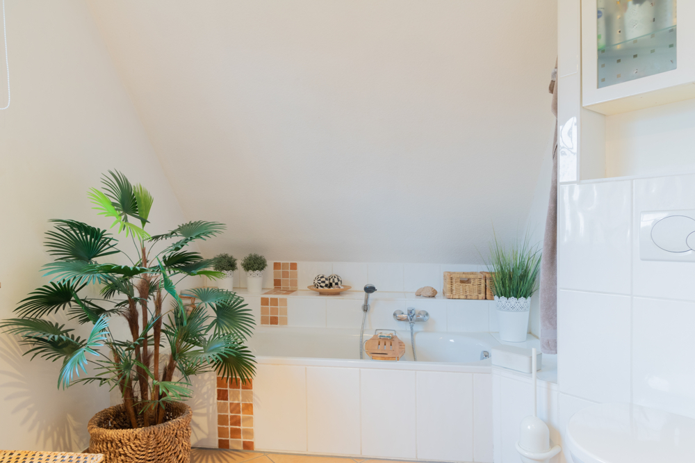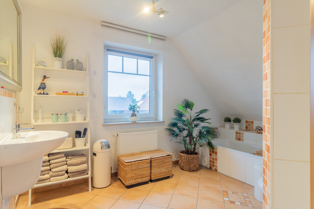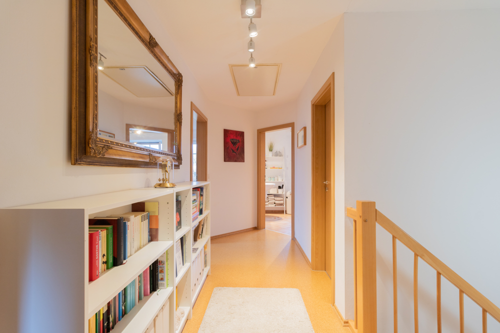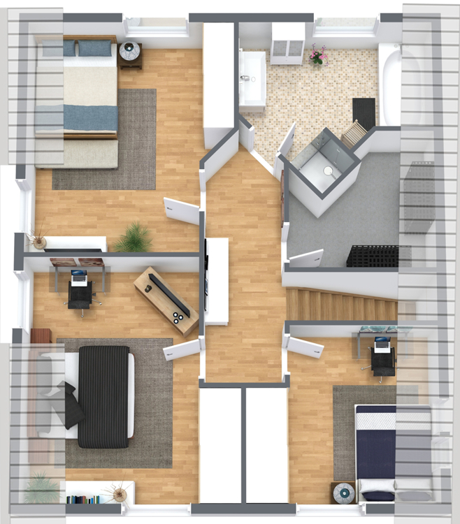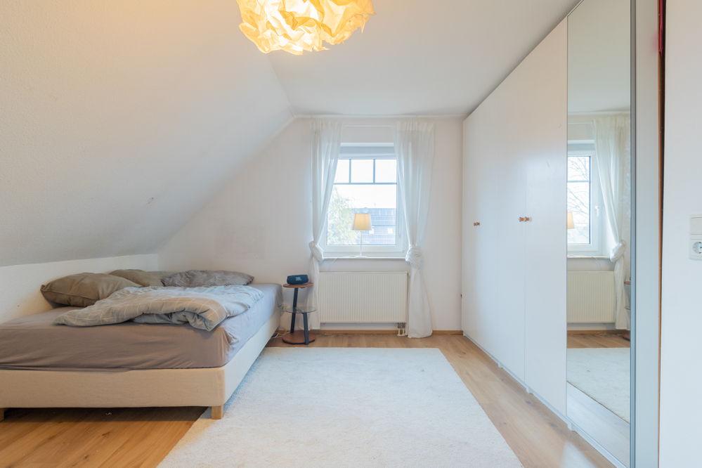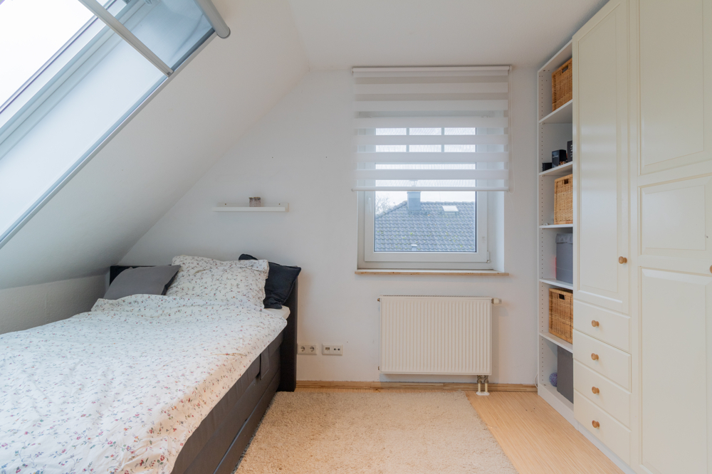 Im Dachgeschoss stehen Ihnen drei geräumige Schlafzimmer zur Verfügung. Die Räume lassen sich flexibel als Elternschlafzimmer, Kinderzimmer, Gästezimmer oder Homeoffice nutzen und sind hell sowie freundlich gestaltet. Das mit einer Fußbodenerwärmung ausgestattete Badezimmer präsentiert sich geräumig und gepflegt in warmen Fliesenfarben. Es verfügt über eine Dusche, eine Badewanne sowie ein Wandhänge-WC. Zusätzlich steht Ihnen auf dieser Etage ein Abstellraum zur Verfügung, der weiteren Stauraum bietet.