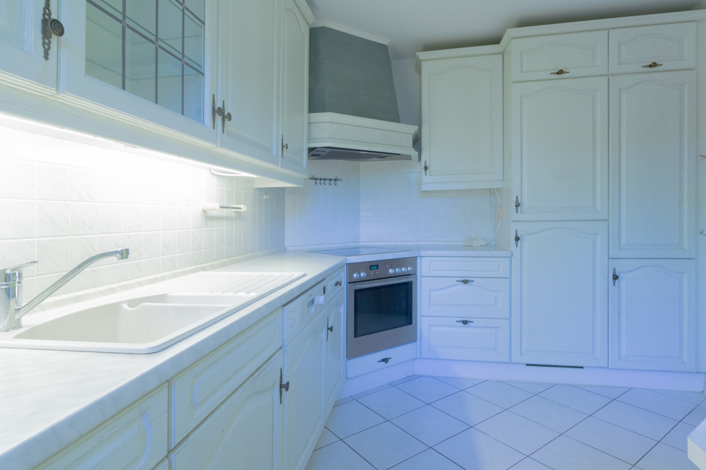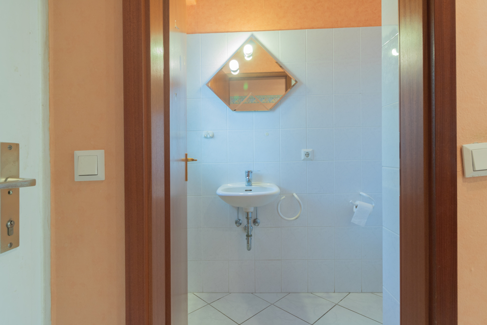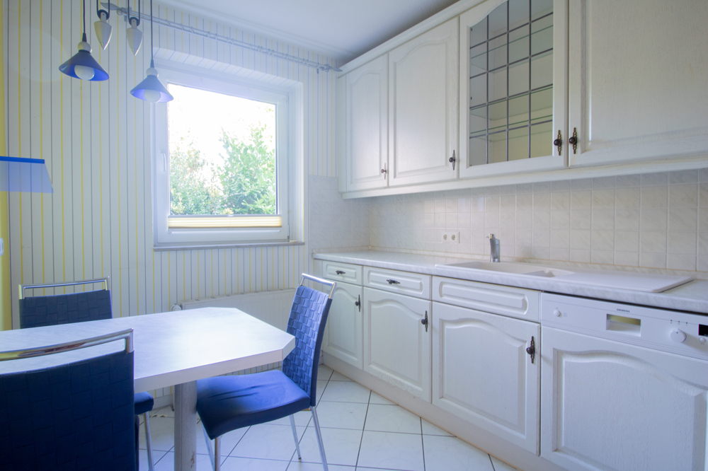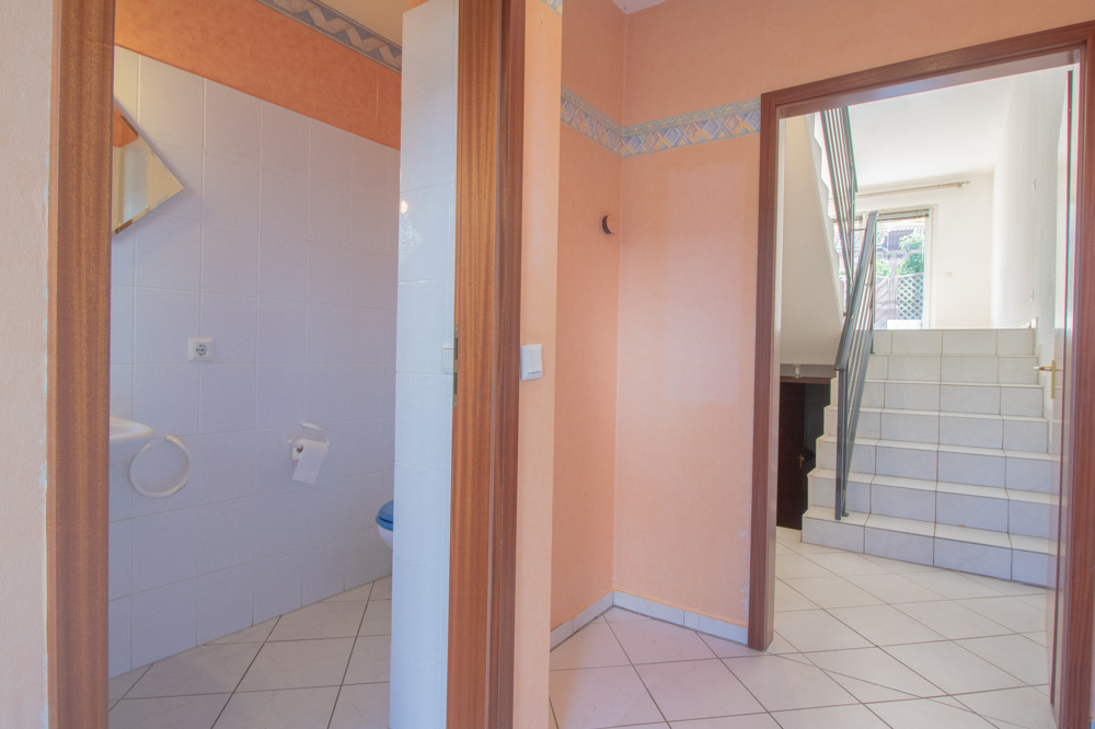Vor dem Haus befindet sich ein praktischer Schuppen für Fahrräder. Über den überdachten Eingangsbereich gelangen Sie in den Flur mit einer Nische für Ihre Garderobe. Von hier erreichen Sie das zeitlos gestaltete Gäste-WC mit Fenster sowie die Küche. Diese ist mit einer hellen Einbauküche samt Elektrogeräten ausgestattet und bietet zahlreiche Ober- und Unterschränke. Ein kleiner Frühstückstisch findet ebenfalls Platz.