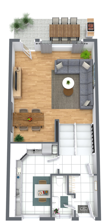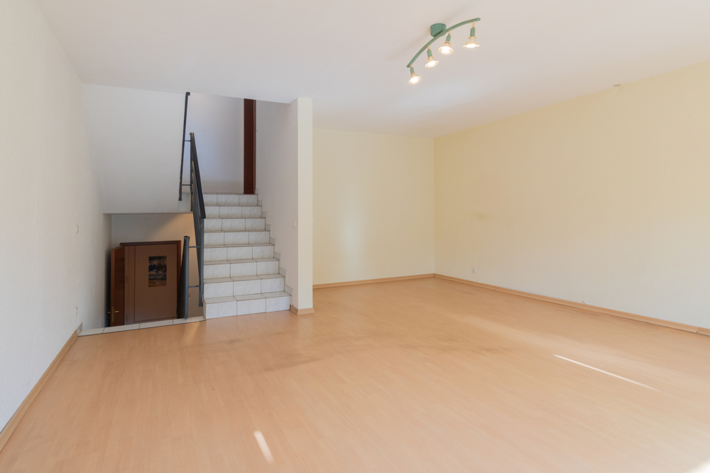 Über wenige Stufen gelangen Sie in den großzügigen Wohn- und Essbereich. Dieser ist hell und einladend gestaltet und bietet direkten Zugang zur Terrasse.
