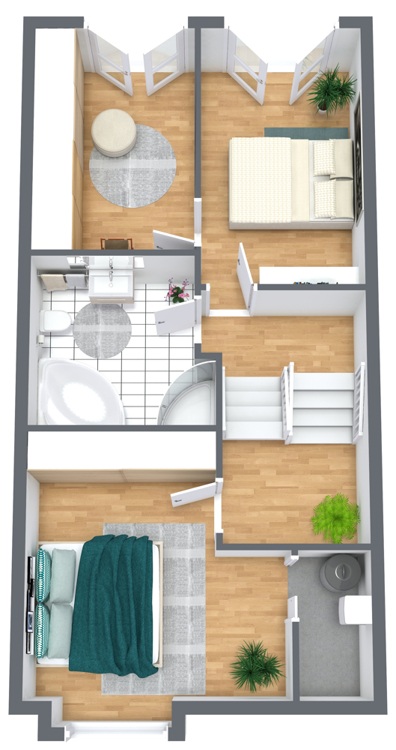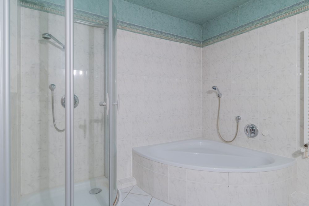 Im Obergeschoss stehen Ihnen drei gut nutzbare Zimmer zur Verfügung. Das Badezimmer ist großzügig geschnitten und mit einer Eckbadewanne, einer Dusche, einem Waschtisch sowie einem Handtuchheizkörper ausgestattet. Über den Flur erreichen Sie außerdem den Spitzboden, der über eine Klappleiter zugänglich ist und zusätzliche Abstellfläche bietet.