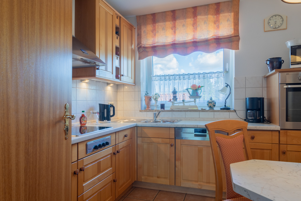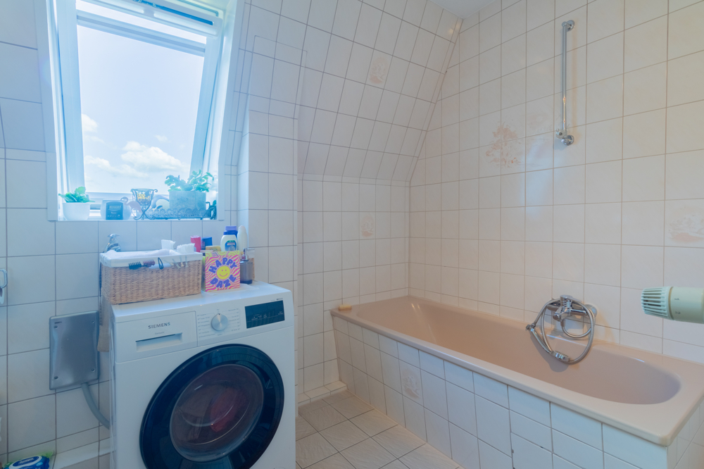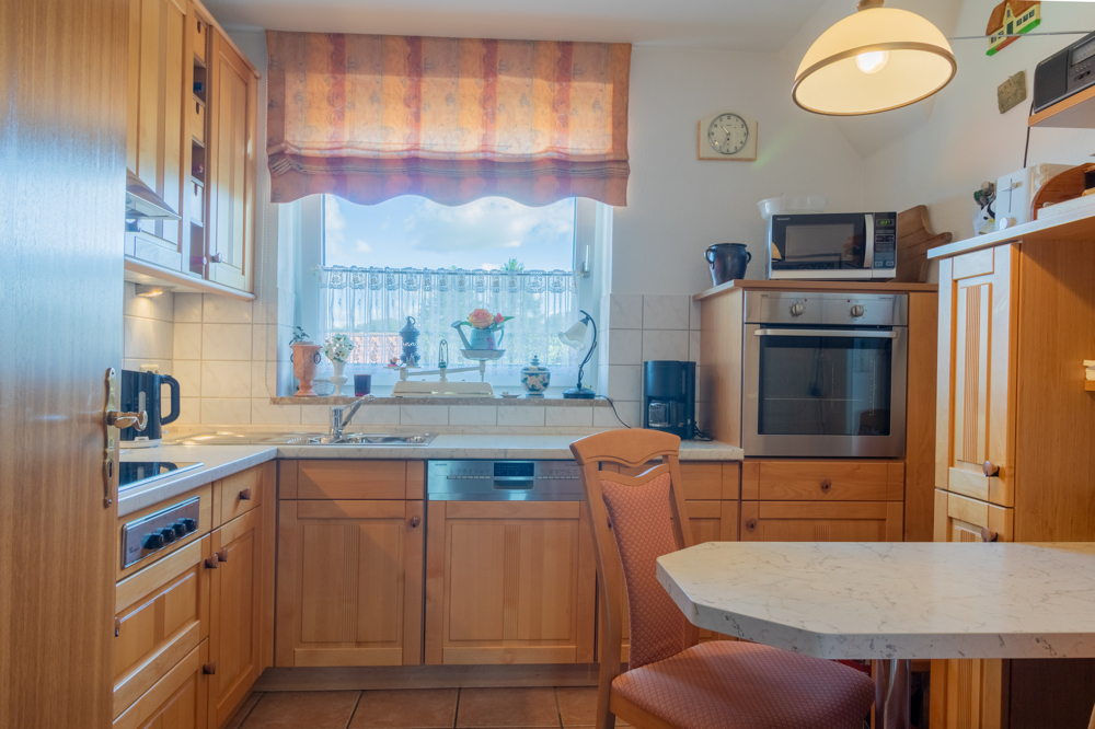 Ein zeitloses Tageslichtbad mit Badewanne sowie Waschmaschinenanschluss sorgt für zusätzlichen Komfort. Die Küche ist geräumig; die vorhandene Einbauküche befindet sich im Eigentum der Mieterin. Darüber hinaus bietet die Wohnung zwei weitere, vielseitig nutzbare Zimmer.