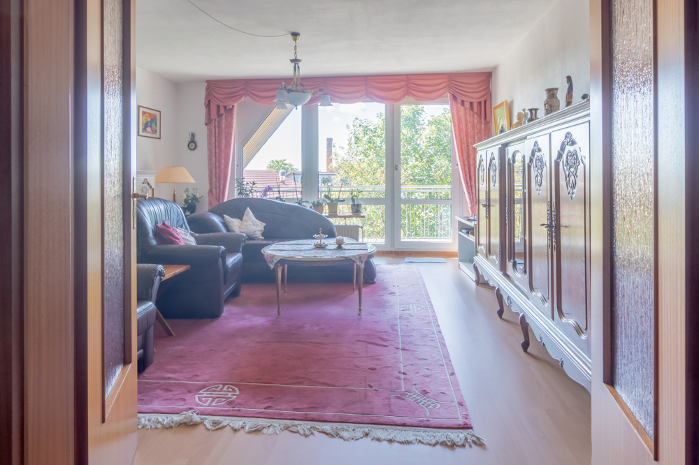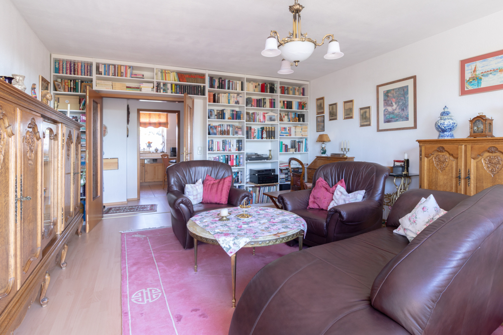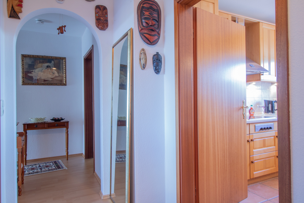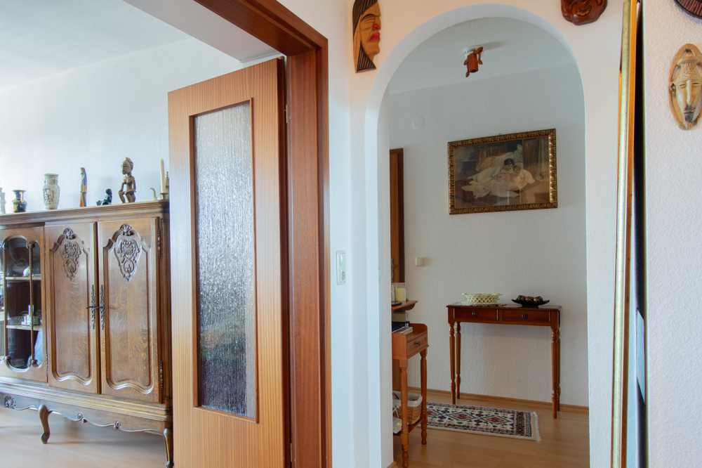 Beim Betreten der Wohnung gelangen Sie in den einladenden Flur, von dem aus sich alle Räume erschließen. Das helle Wohnzimmer überzeugt durch gute Stellmöglichkeiten und bietet Zugang zur großzügigen, nach Süden ausgerichteten Loggia. Diese wurde erst kürzlich renoviert und mit einem modernen Bodenbelag in elegantem Grau ausgestattet. Abgerundet wird das Gesamtbild durch eine schmiedeeiserne Brüstung und ein Edelstahlgeländer.