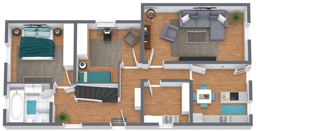 Beim Betreten des Hauses empfängt Sie ein heller und großzügiger Eingangsbereich, von dem aus sich die einzelnen Räume erschließen. Es stehen Ihnen zwei Schlafzimmer zur individuellen Nutzung zur Verfügung. Das neuwertige Tageslichtbad ist mit einer Badewanne, einer Dusche, einem Wandhänge-WC und einem modernen Waschtisch mit Schubladen ausgestattet – zeitlos, hell und gepflegt. Das großzügige Wohnzimmer bildet mit rund 25 m² das Herzstück des Hauses und bietet ausreichend Platz für die ganze Familie. Die ca. 15 m² große Küche verfügt über einen direkten Zugang in den Garten. Alle Anschlüsse sind bereits vorhanden – gestalten Sie hier Ihre persönliche Traumküche ganz nach Wunsch. Angrenzend befindet sich ein Hauswirtschaftsraum mit Platz für Haushaltsgeräte und zusätzliche Abstellmöglichkeiten – ein durchdachtes Grundrisskonzept!