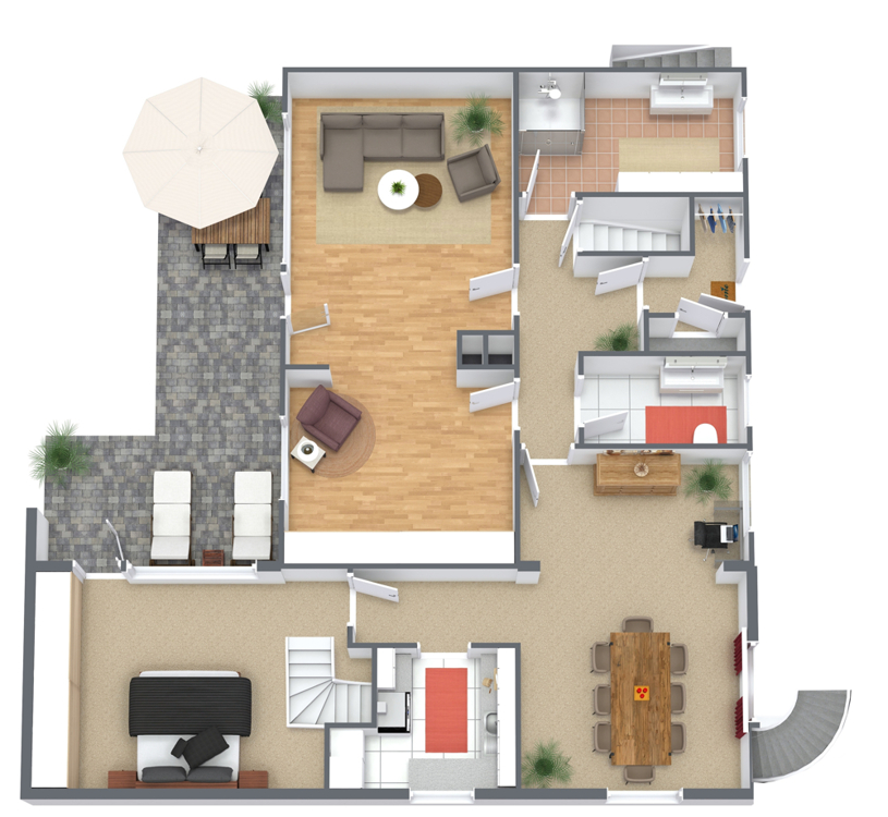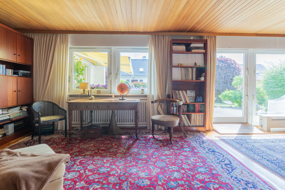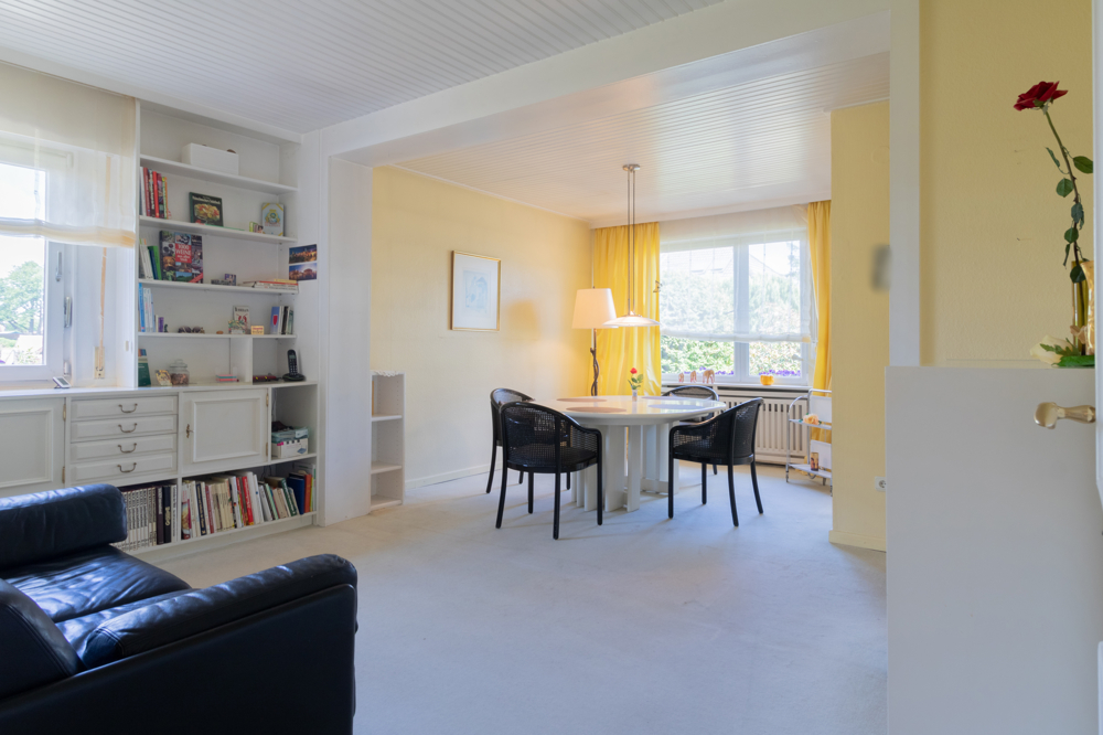 Beim Betreten des Hauses gelangen Sie in einen praktischen Vorflur mit einem abgetrennten Garderobenbereich – ideal zum komfortablen Ablegen von Jacken und Schuhen. Eine angrenzende Abstellkammer sorgt für zusätzlichen Stauraum. Vom Flur aus betreten Sie das großzügige Wohnzimmer mit gemütlichem Lesezimmer und direktem Zugang zur sonnigen Terrasse mit Markise. Dank der Raumgröße lässt sich das Wohnzimmer bei Bedarf in zwei separate Schlafzimmer unterteilen. Das helle Tageslichtbad ist mit einer bodentiefen Dusche ausgestattet und bietet modernen Komfort. Ein separates WC steht Ihnen auf dieser Ebene zur Verfügung. Der angrenzende Essbereich bietet viel Platz für geselliges Beisammensein und grenzt direkt an die Küche, die mit einer funktionalen, dem Baujahr entsprechenden Einbauküche ausgestattet ist. Ein weiteres, großzügig geschnittenes Schlafzimmer mit ebenfalls direktem Zugang zur Terrasse, rundet das Raumangebot ab.