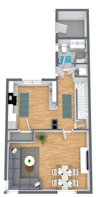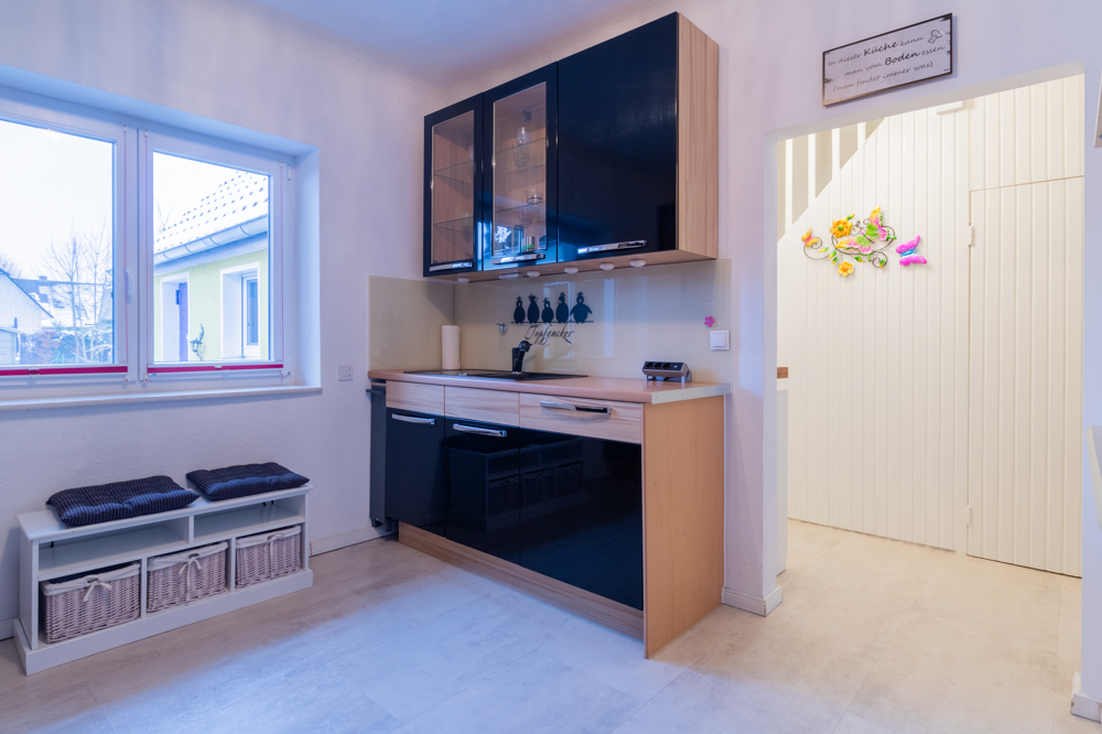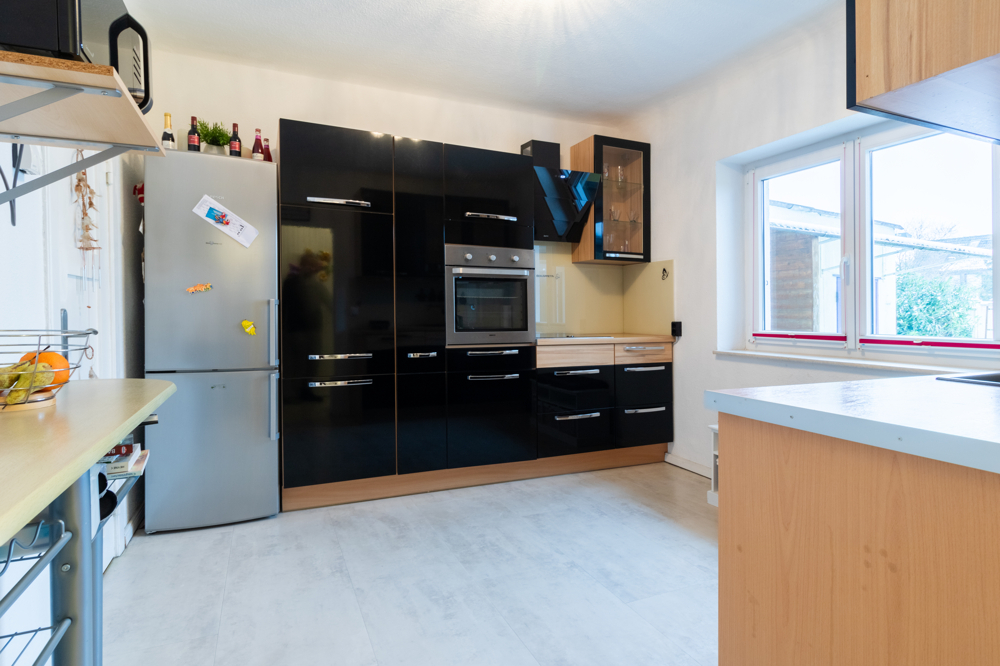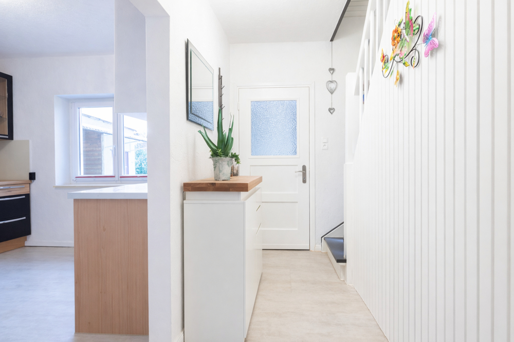 Der Zugang zum Haus erfolgt über den Anbau, der Sie in den einladenden Eingangsbereich führt. Von hier aus erreichen Sie das stilvolle Tageslichtbad mit bodenebener Dusche sowie einen funktionalen Abstellraum mit Waschmaschinenanschluss. Die großzügig geschnittene Küche überzeugt mit einer separaten Speisekammer und bietet ausreichend Platz für kulinarische Entfaltung. Die Einbauküche (ca. Baujahr 2011) ist mit einem modernen Induktionskochfeld ausgestattet. Spülmaschine und Kühlschrank sind nicht Bestandteil des Angebots. Das Wohnzimmer präsentiert sich hell und freundlich und wird durch zahlreiche Fensterflächen mit Tageslicht durchflutet. Die Plamecodecke unterstreicht das moderne Wohnambiente. Flur, Küche und Wohnzimmer sind mit einem ansprechenden Designboden ausgestattet. Ein besonderer Blickfang ist die stilvoll aufgearbeitete Treppe mit integrierten Spots. Das Erdgeschoss ist mit einer Fußbodenheizung versehen.
