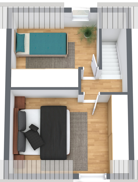 Im Obergeschoss befinden sich zwei gemütliche Zimmer, die durch ihre Dachschrägen eine besonders warme und behagliche Atmosphäre ausstrahlen. Maßgefertigte Einbauschränke sorgen für optimalen Stauraum. Über den Flur gelangen Sie mittels Leiter auf den Dachboden, der zusätzliche Abstellfläche bietet.