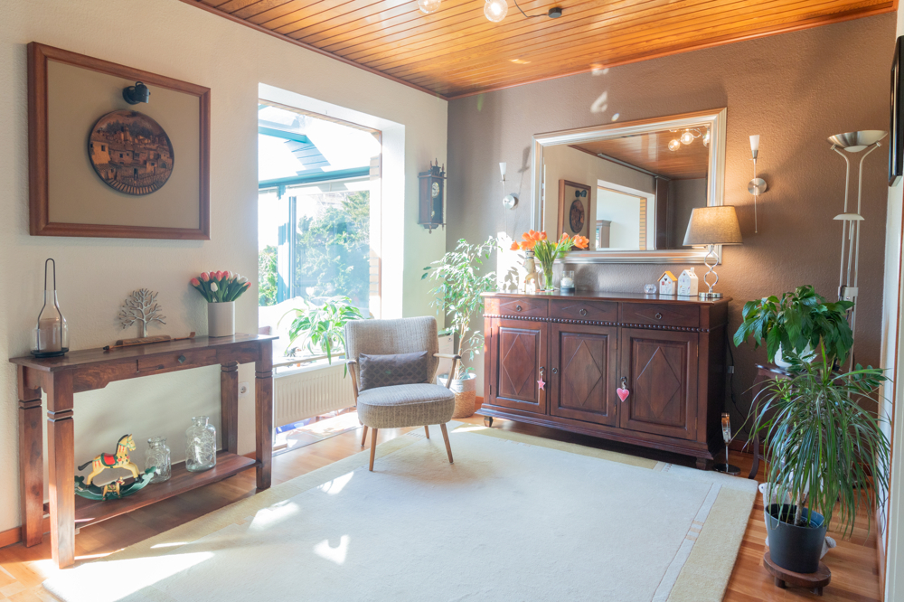 Der Zugang zum Haus erfolgt über den Eingangsbereich, von dem aus Sie in die zentralen Wohnräume gelangen. Das Wohnzimmer präsentiert sich hell und freundlich und wird durch den angrenzenden Wintergarten sinnvoll erweitert. Dieser bietet einen schönen Blick in den Garten und schafft eine angenehme Verbindung zwischen Innen- und Außenbereich. Von hier aus gelangen Sie auf die Terrasse, die zu entspannten Stunden im Freien einlädt. Zusätzlich steht im Erdgeschoss ein Gäste-WC zur Verfügung. Die Küche wurde im Jahr 2018 erneuert und verfügt über eine zeitgemäße Ausstattung sowie ausreichend Platz für den täglichen Bedarf. Insgesamt bietet das Erdgeschoss eine funktionale und zugleich wohnliche Aufteilung.