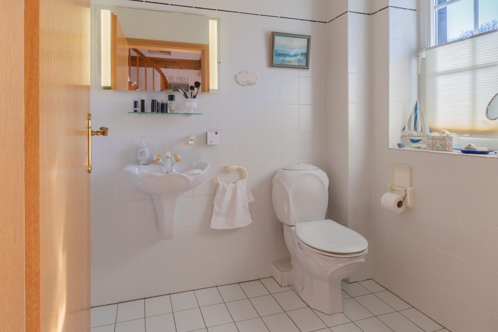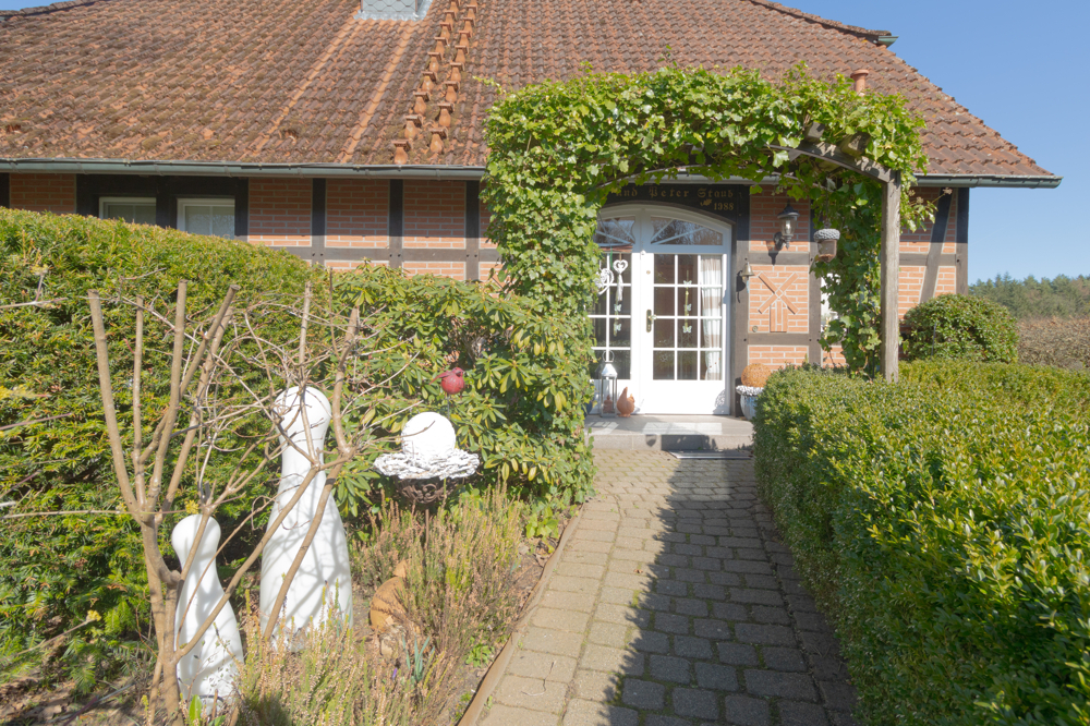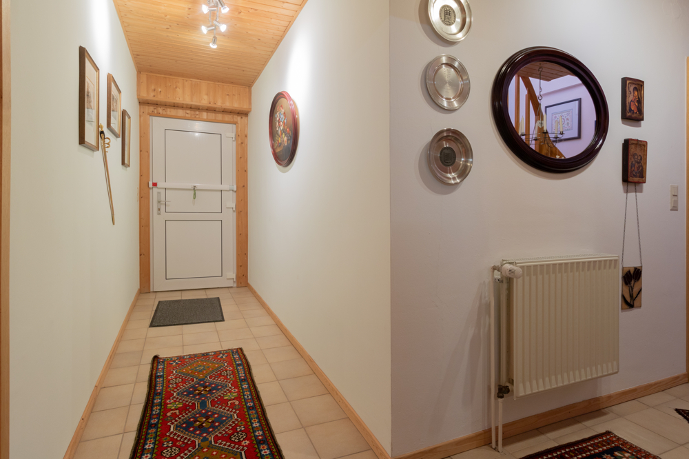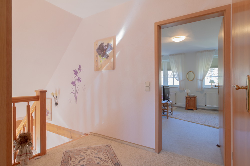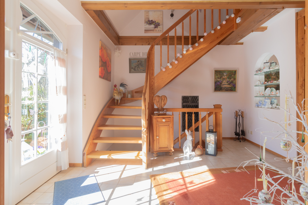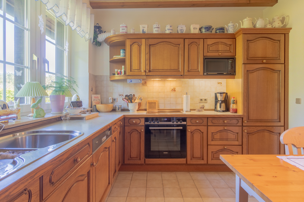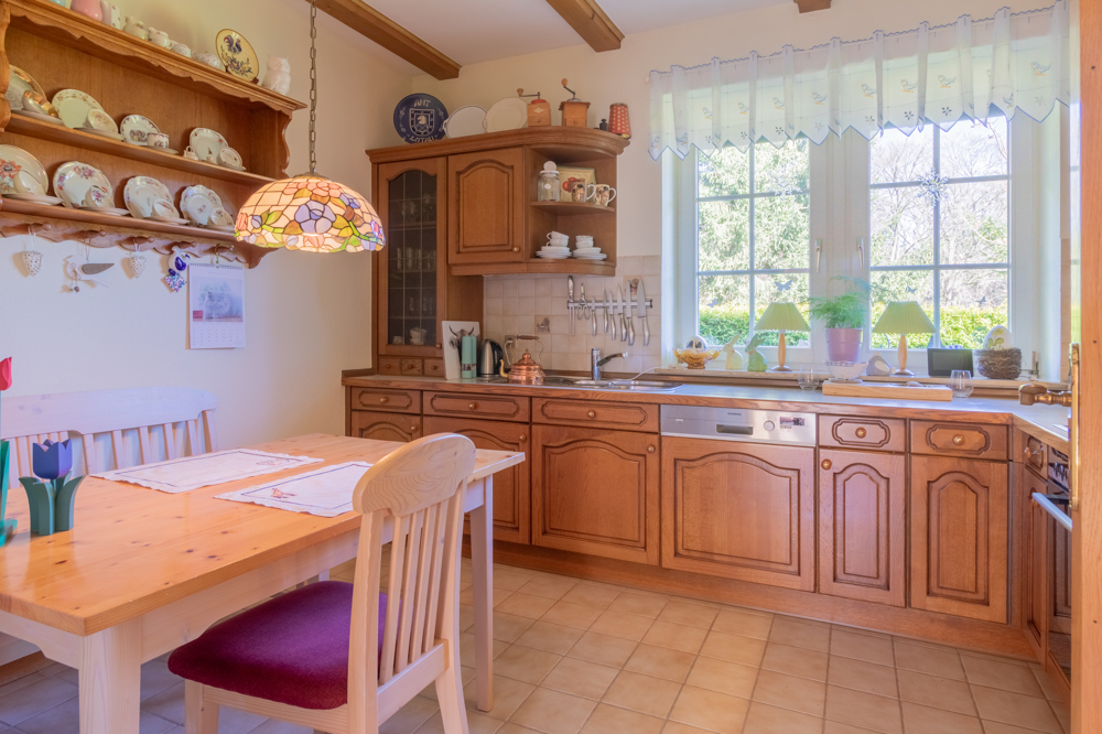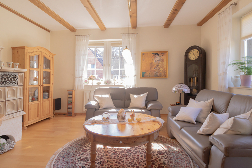 Das Erdgeschoss empfängt Sie mit einer durchdachten und familienfreundlichen Raumaufteilung. Der einladende und helle Eingangsbereich führt Sie in die zentralen Wohnräume. Das großzügige Wohn- und Esszimmer bildet das Herzstück des Hauses und begeistert mit sichtbaren Holzbalken, die den gemütlichen Landhauscharakter unterstreichen. Ein Kamin sorgt hier für eine besonders behagliche Atmosphäre und wurde im Jahr 2021 modernisiert – ideal für gemütliche Stunden auch an kalten Tagen. Die Küche ist mit einer Einbauküche ausgestattet und bietet ausreichend Platz für einen Esstisch – ideal für den gemeinsamen Start in den Tag. Ergänzt wird das Raumangebot durch ein Gäste-WC sowie einen Hauswirtschaftsraum mit Anschlüssen für Waschmaschine und Trockner. Ein praktischer Vorratsraum sorgt zusätzlich für Stauraum und kurze Wege im Alltag.