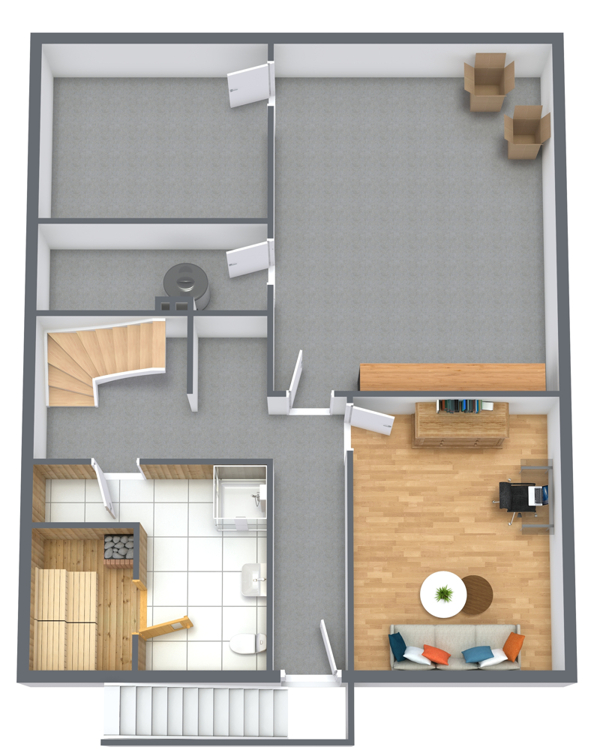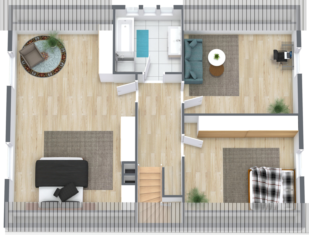 Im Dachgeschoss erwarten Sie drei gut geschnittene Zimmer. Das großzügige Elternschlafzimmer bietet viel Platz und angenehme Rückzugsmöglichkeiten. Durch eine mögliche Grundrissanpassung ließen sich hier bei Bedarf auch zwei separate Zimmer realisieren. Zwei weitere Räume eignen sich ideal als Kinder-, Gäste- oder Arbeitszimmer. Das Tageslichtbad ist mit einer Badewanne sowie einer Dusche ausgestattet und bietet somit Komfort für die ganze Familie. Die durchdachte Aufteilung und die angenehmen Raumgrößen sorgen auch hier für ein wohnliches und harmonisches Gesamtbild.